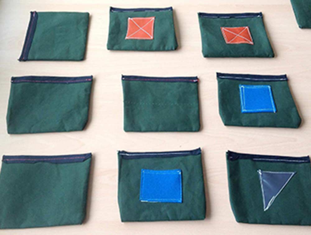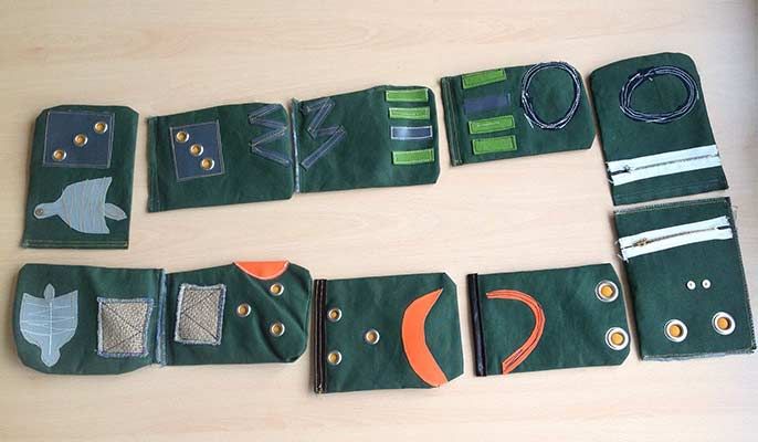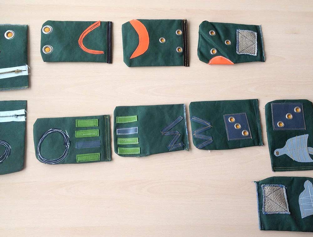 In our opinion, commercially available therapy materials are not usually optimally suited to every patient. This game, which we developed ourselves, consists of 10 small bags filled with granules that are haptically and tactilely informative. The fabric is sewn from thick canvas tarpaulin and quilted with my Pfaff 245 (a powerful industrial sewing machine). The fabric squares measure approx. 15 x 10 cm and weigh approx. 50 grams. The eyelets were embossed with a twist spindle.
