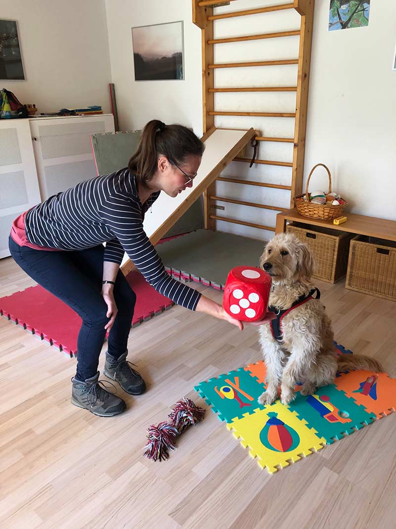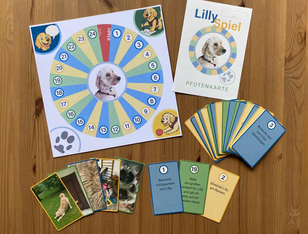 This game is specially tailored to our therapy dog Lilly. The dice game has three different areas: talking, drawing and actions, which are colour-coded. The corresponding coloured cards explain the task in words and pictures. The children have to complete tasks together with the dog, which is great fun for both sides, as well as having therapeutic benefits.