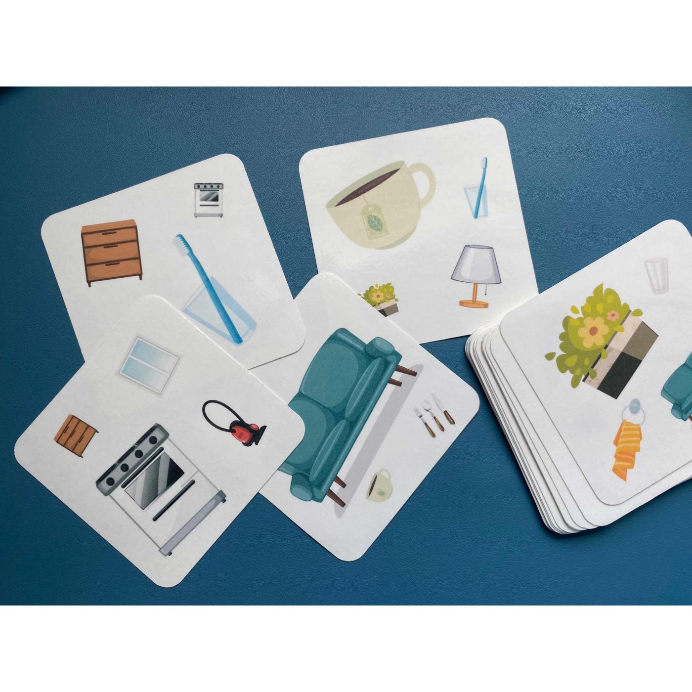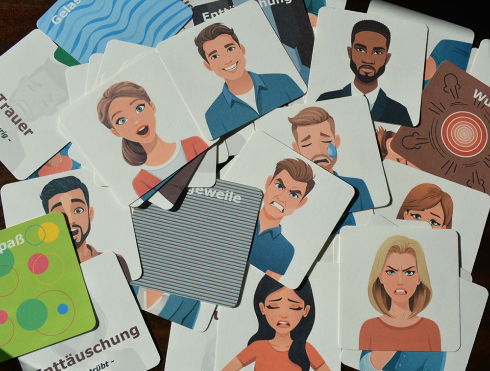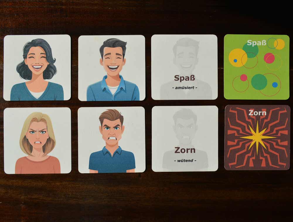The facial expression memory game consists of cards depicting different facial expressions of people. There are male and female versions. Another card with a grey background shows the name of the emotional state. There is also a card with a facial expression translated as a pattern. There are several ways to play this game. It is particularly suitable for people with autism and aphasia to help them learn to interpret emotions better. It is also exciting for young children to expand their vocabulary.
